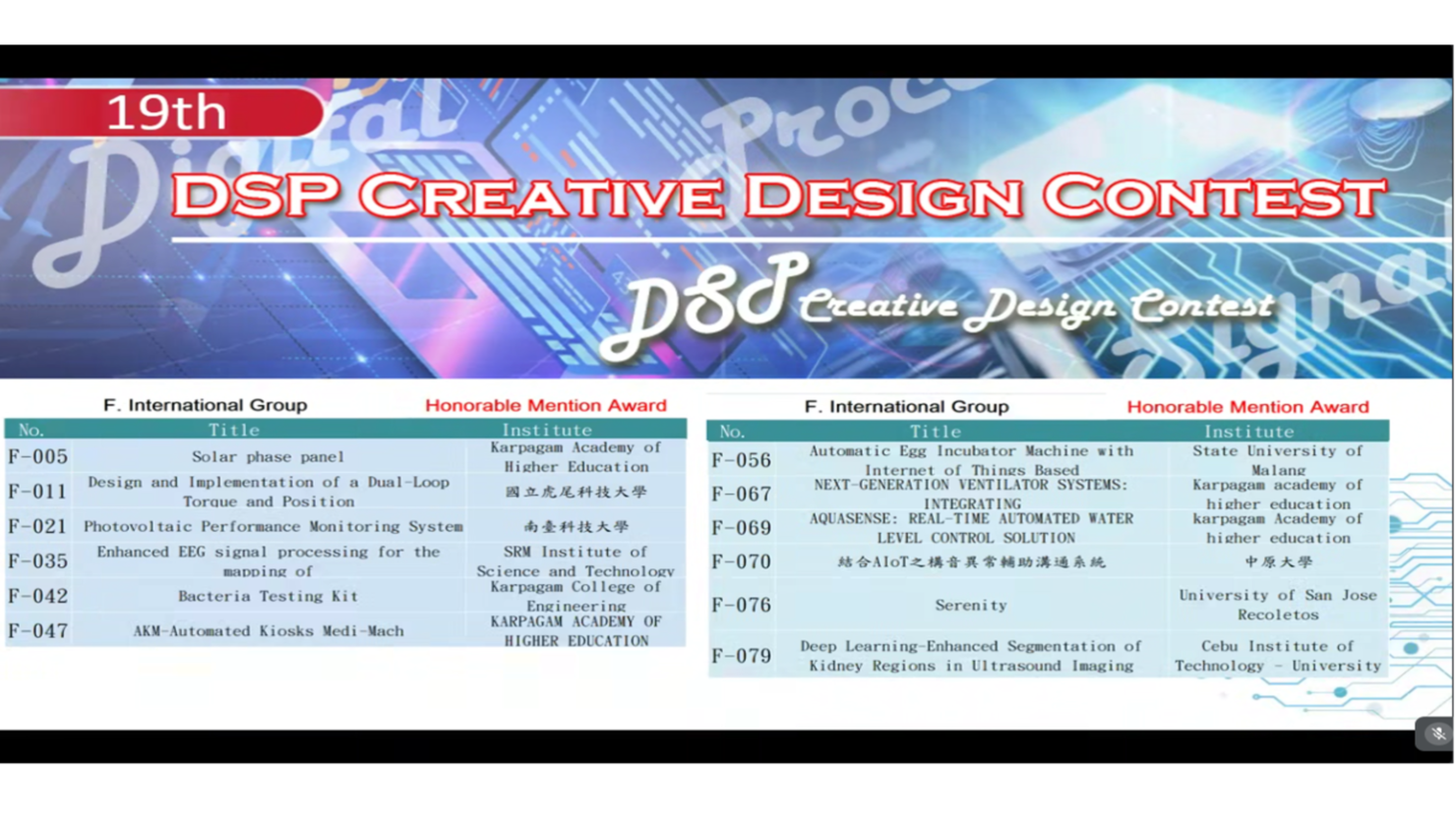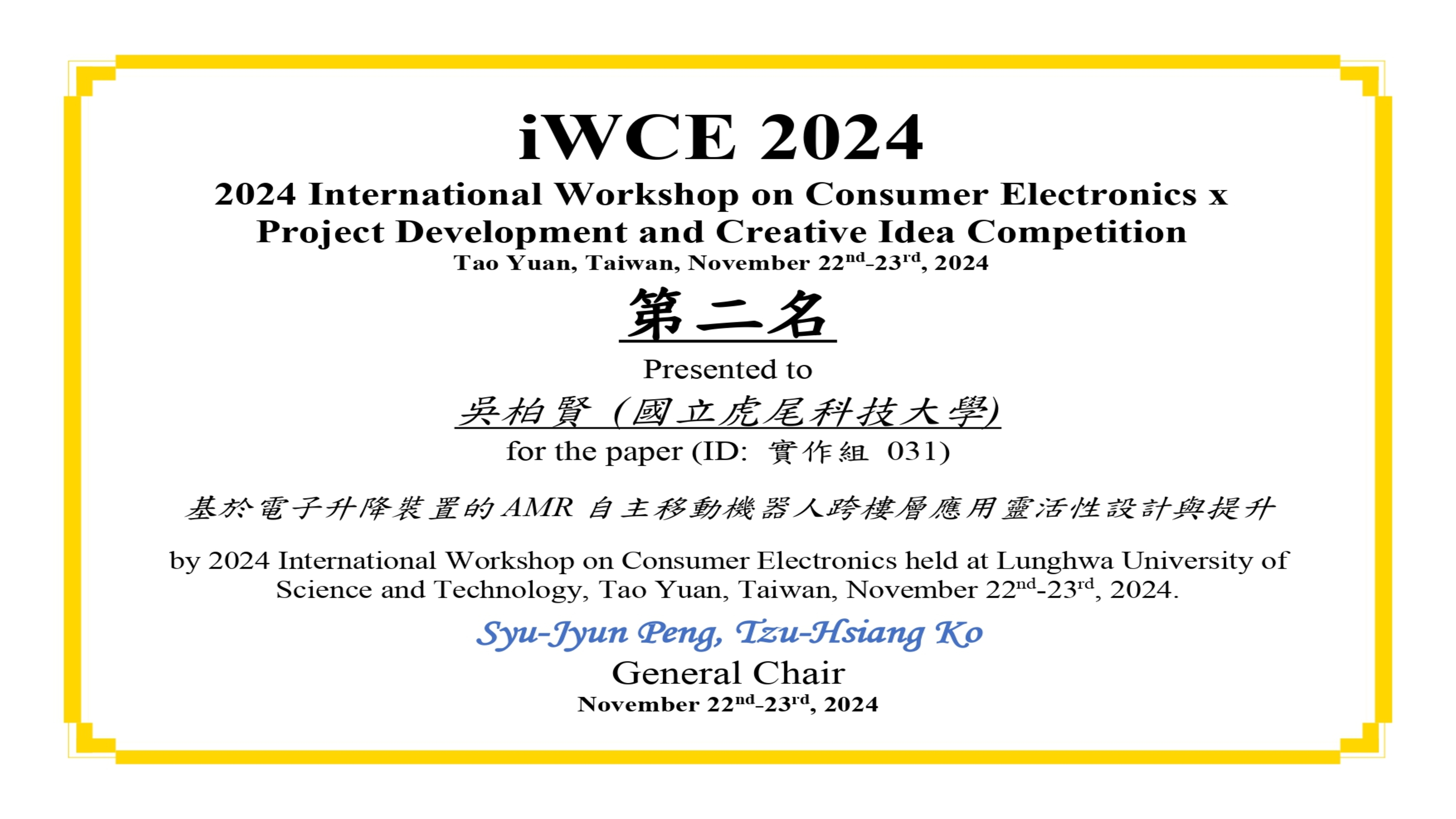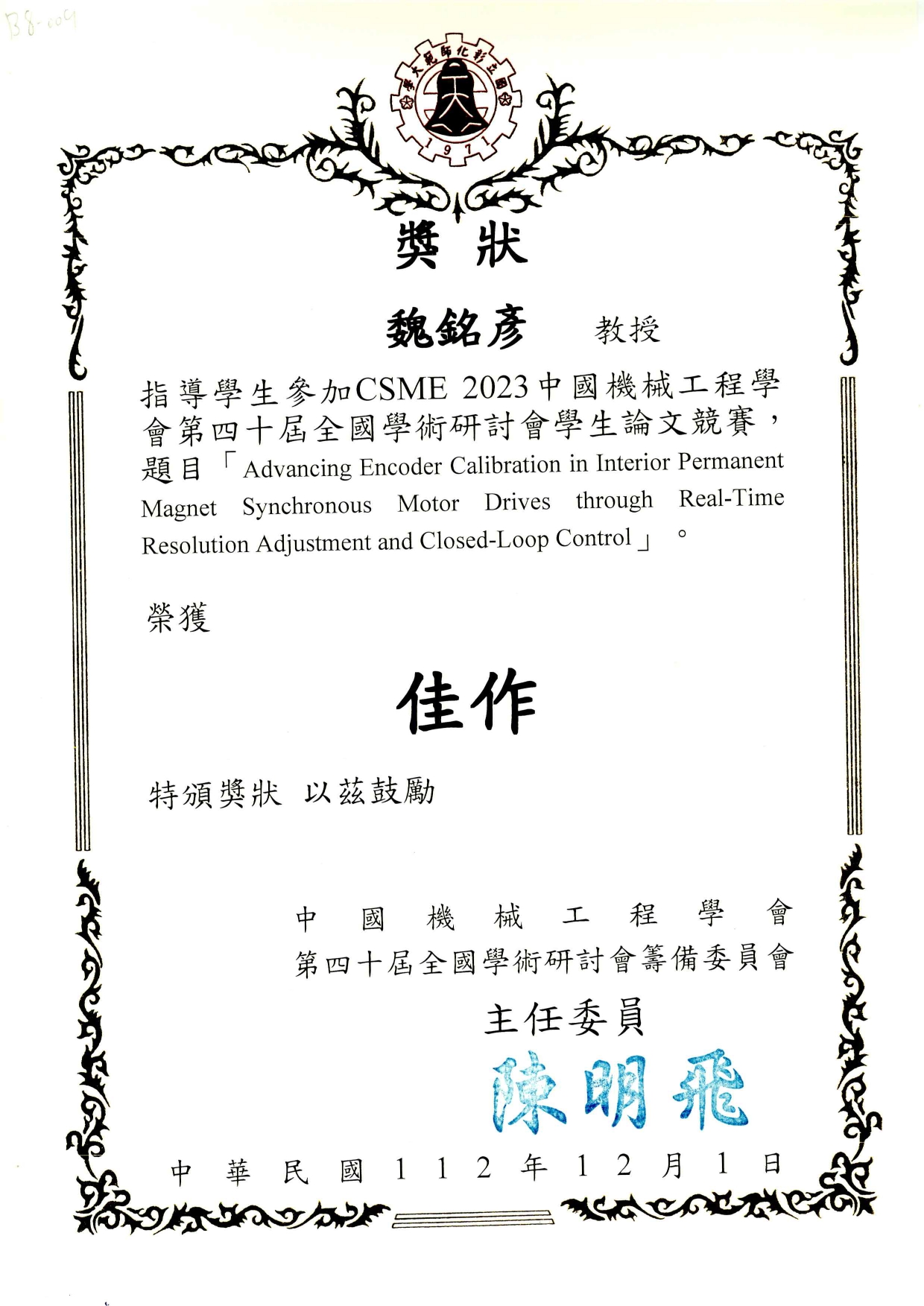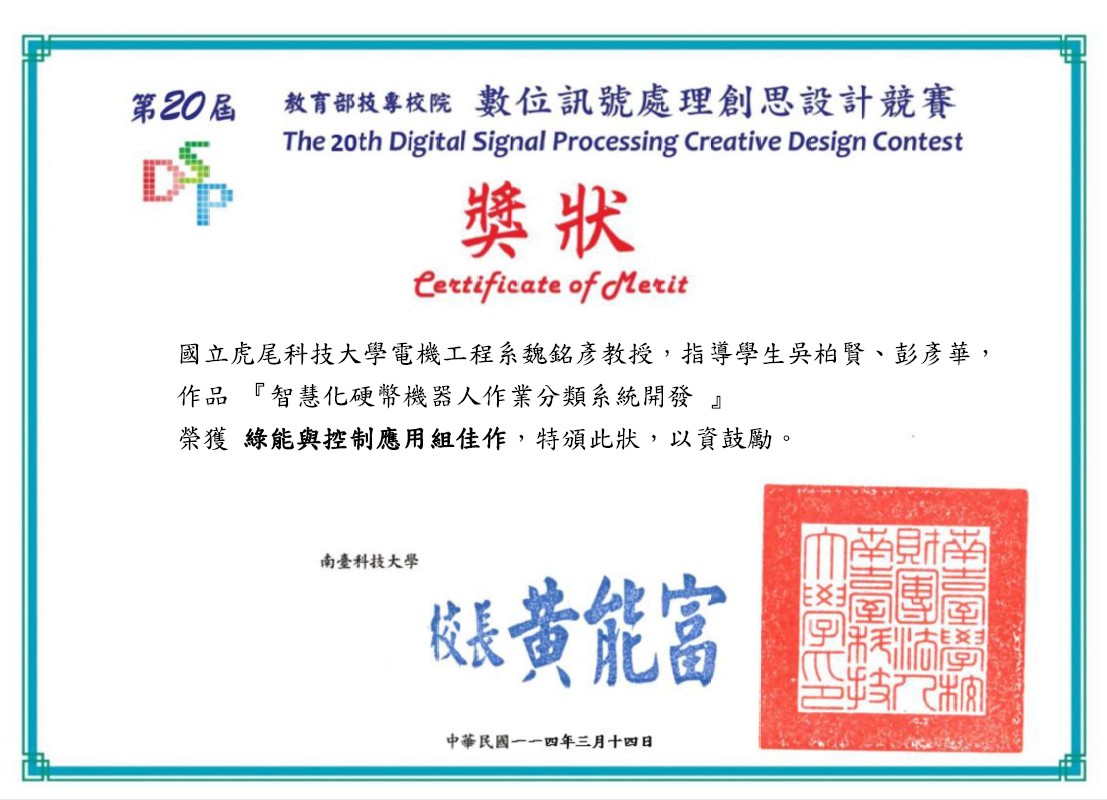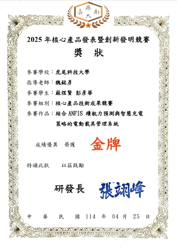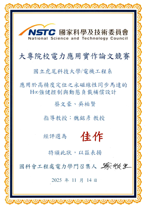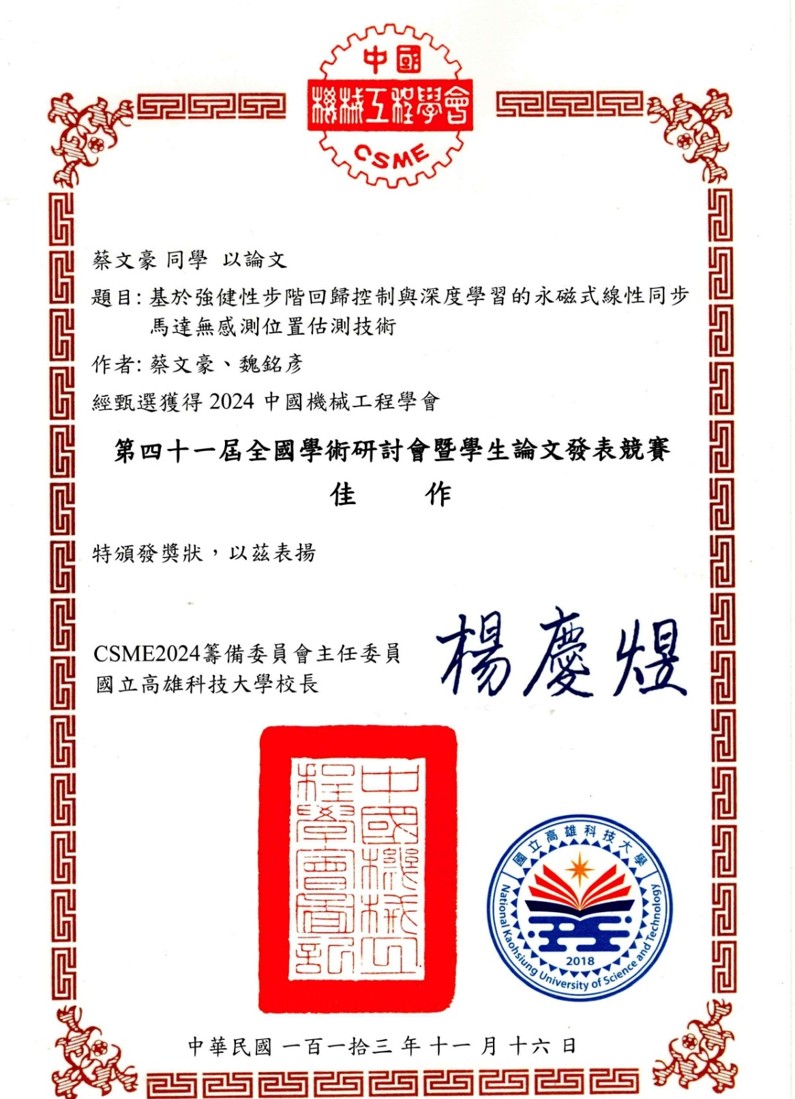 恭賀 碩電機二甲-蔡文豪 在競賽中表現亮眼. (蔡文豪-基於強健性步階回歸控制與深度學習的永磁式線性同步馬達無感測位置估測技術)