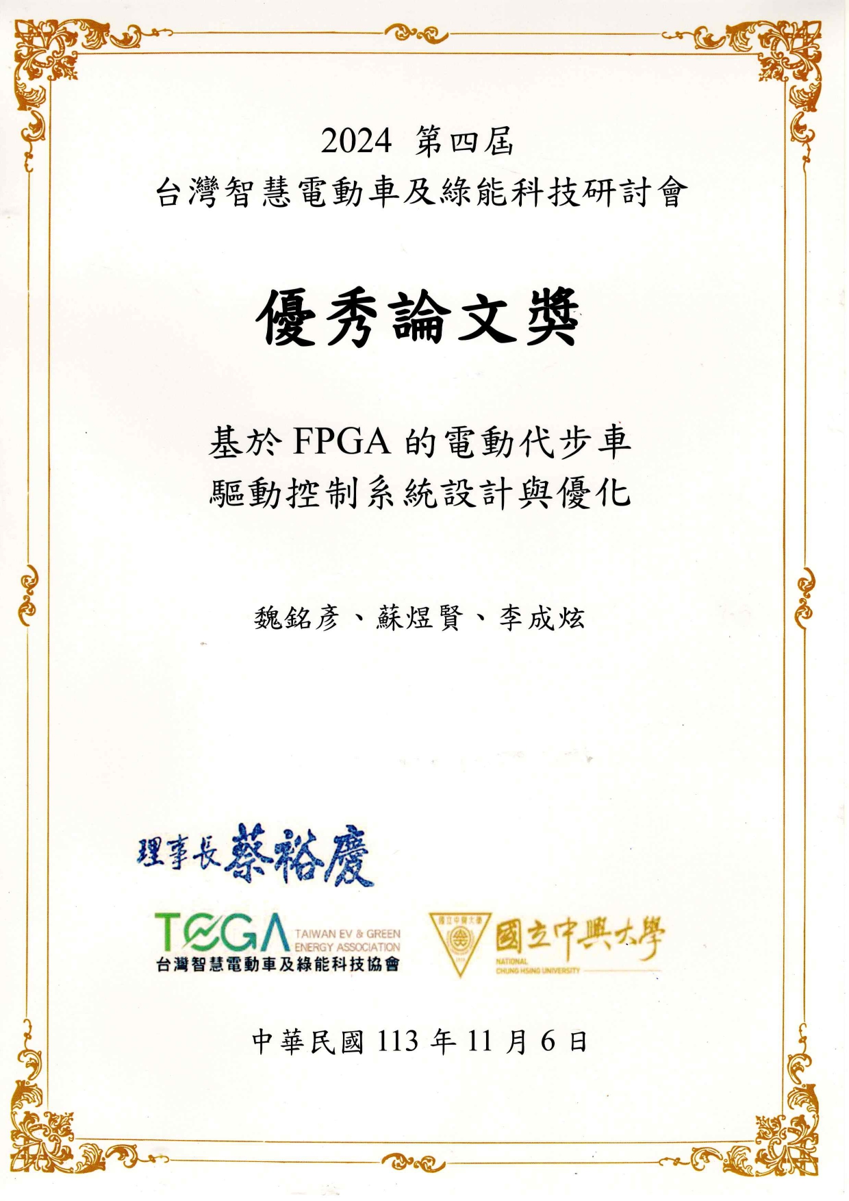 恭賀 "魏銘彥教授、碩電機一甲-蘇煜賢、四電機四甲-李成炫"在研討會中表現亮眼. (基於FPGA的電動代步車驅動控制系統設計與優化).