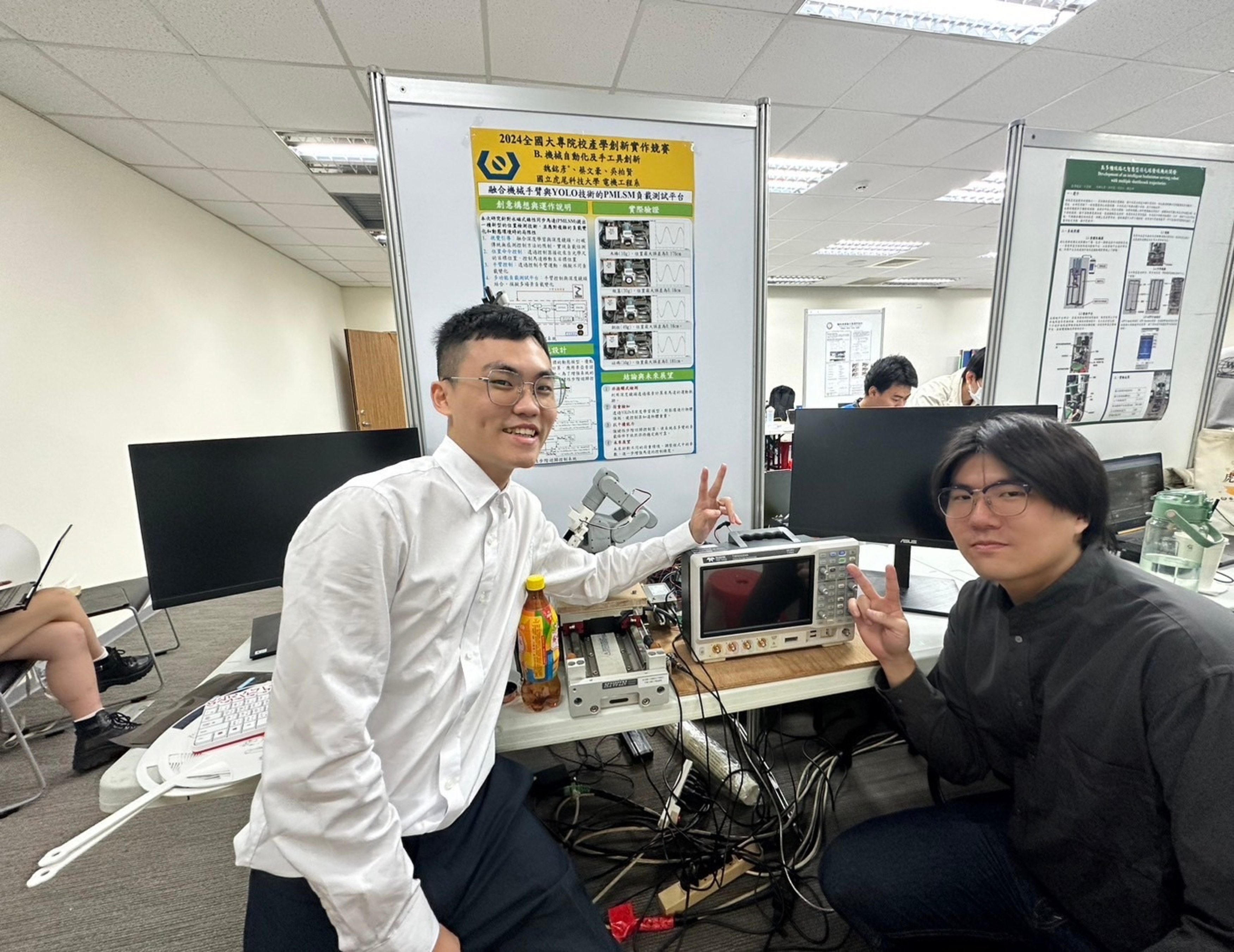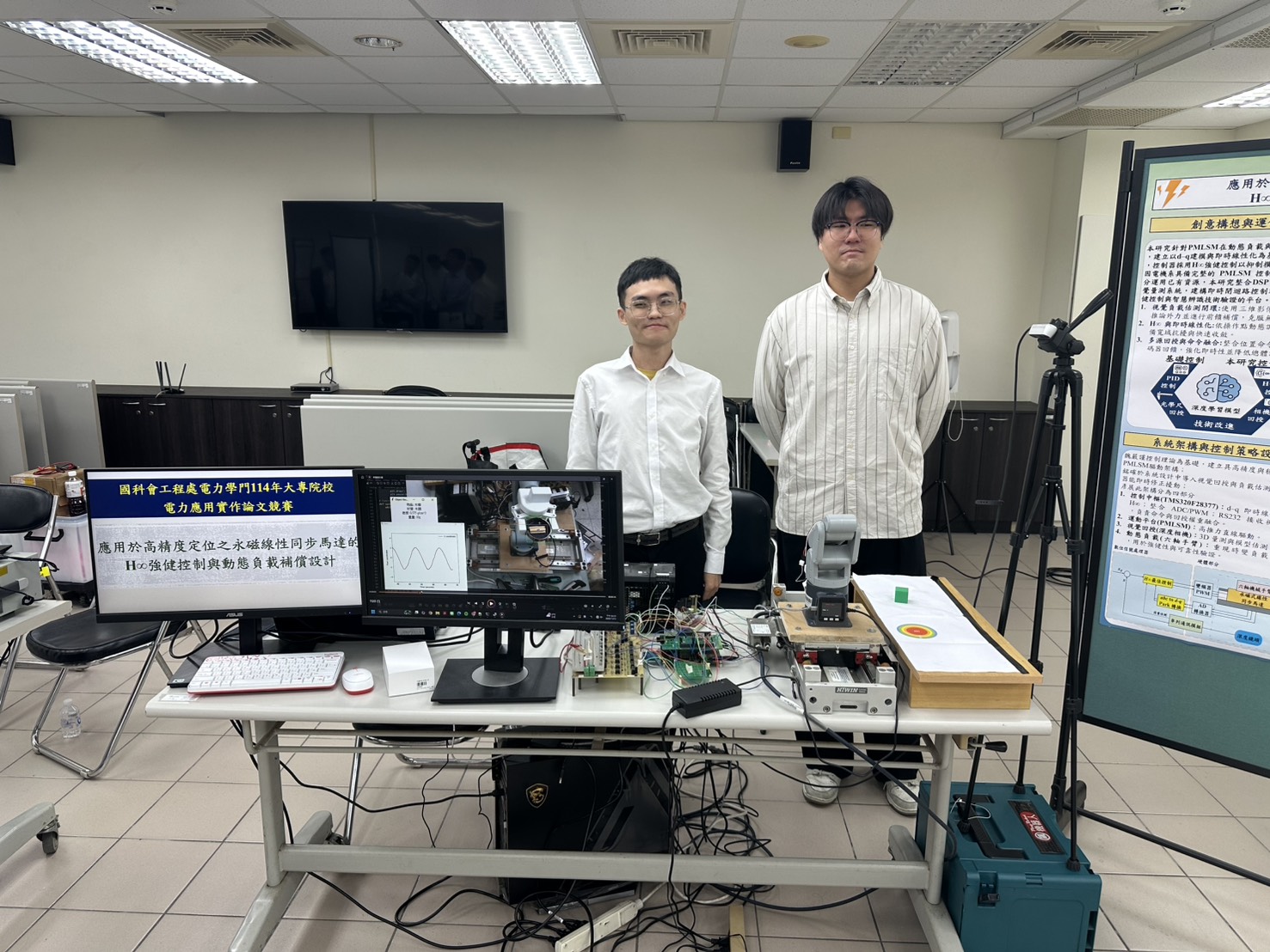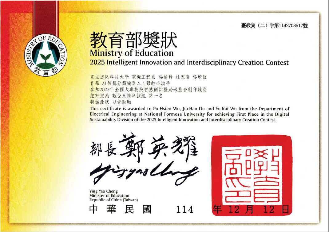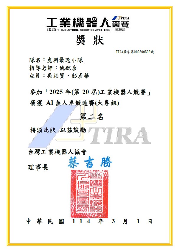 恭賀 "碩電機二甲-蔡文豪 碩電機一甲-吳伯賢"在競賽中表現亮眼(融合機械手臂與YOLO技術的PMLSM負載測試平台).