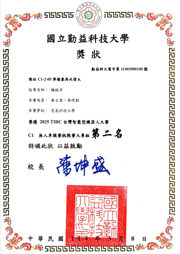 恭賀 "碩電機一甲-吳伯賢、二電機二甲-彭彥華" 在AI無人車競賽中表現亮眼. 兩位同學利用假日時間勤奮練習,讓大車也能在狹小的車道地圖中順利完成.