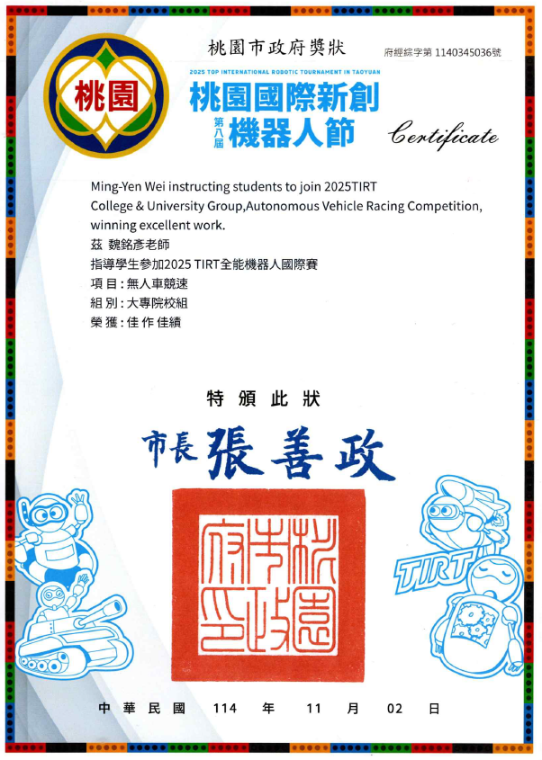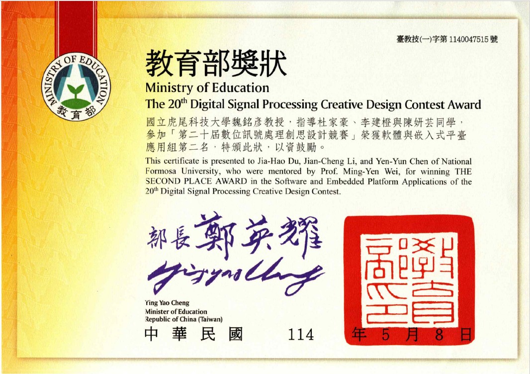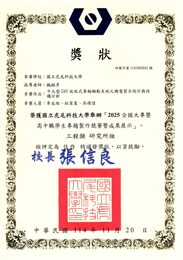 恭喜 "碩電機一甲-李成炫、杜家豪、吳堉愷" 在專題製作競賽暨成果展示-工程類_研究所組比賽中表現亮眼.